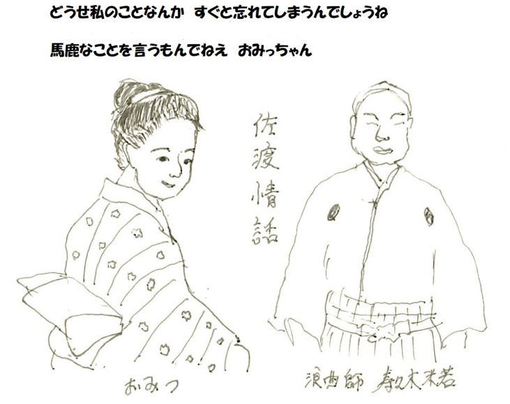 佐渡情話は、新潟柏崎から大工仕事で、佐渡に滞在した大工に恋した若い娘の 「おみつさん」 の恋物語です。寿々木米若は、昭和の時代に人気を博した浪曲師です。