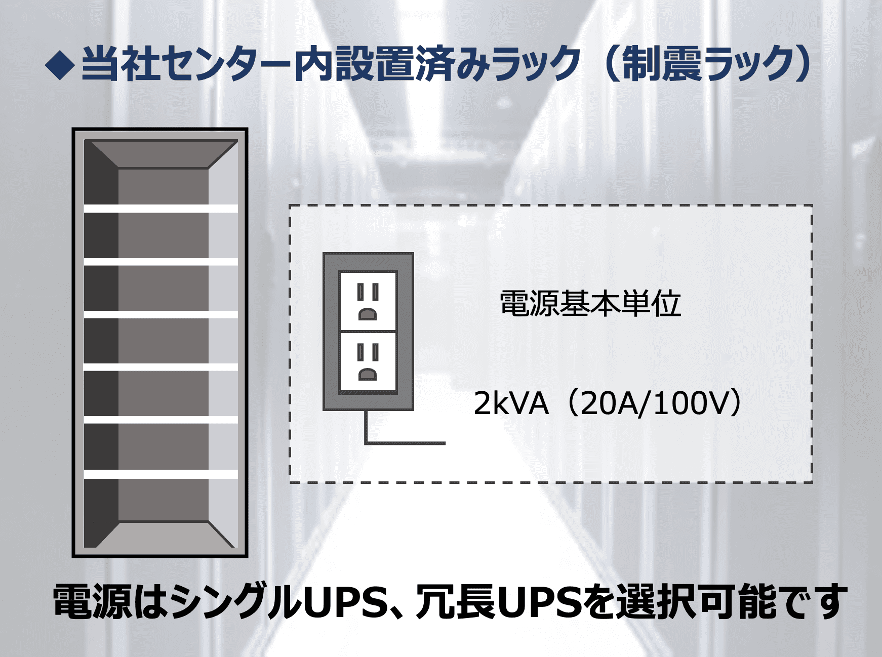 | 1ラック | 40U | 定格2kVA×1系統 (実効消費電力 1.6Kw) |
