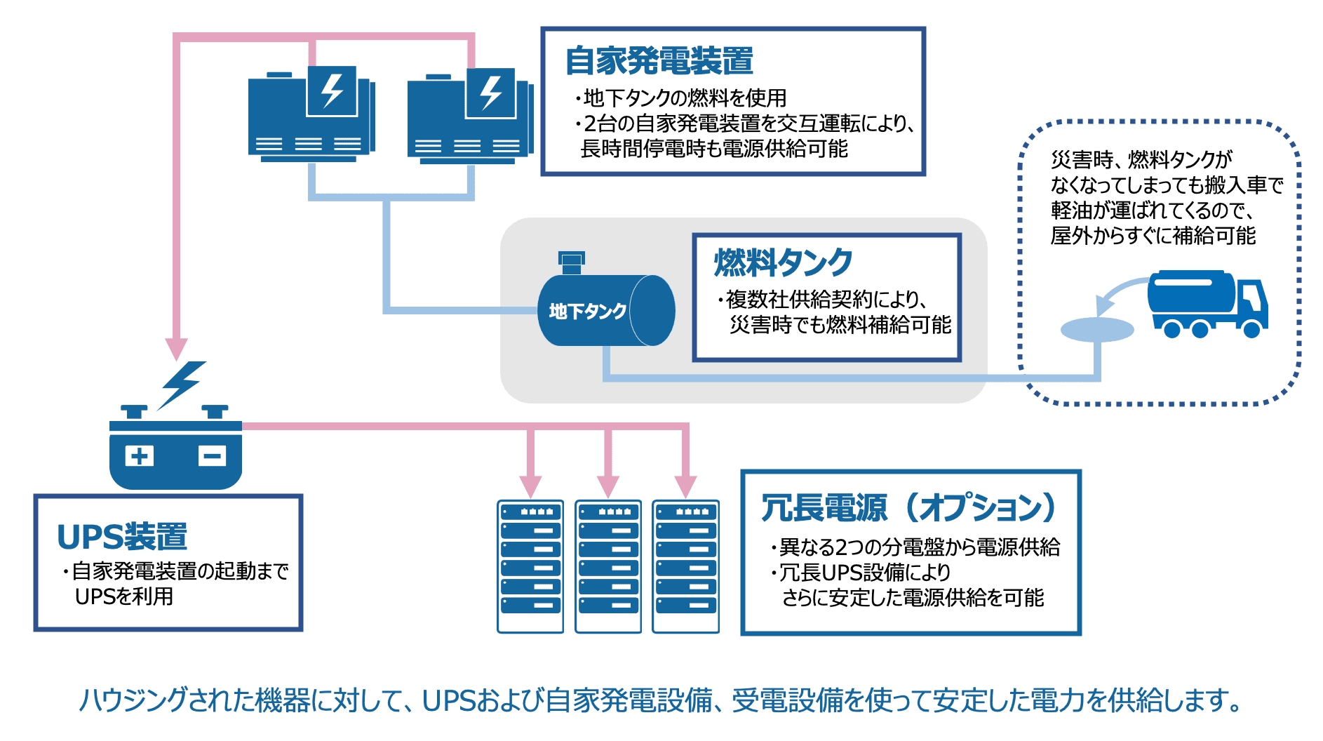 高圧受電設備の他、UPS設備による瞬電対策、万一の長時間停電にも自家発電設備により安定かつ継続した電源供給(72時間)をいたします。