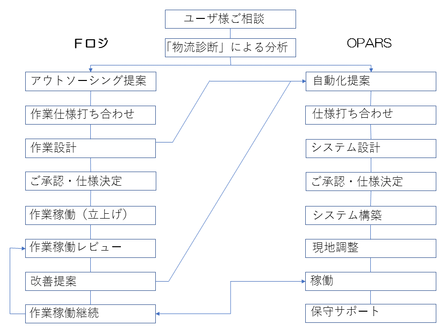 OPARS(Osaki Packing Automation Robot System)は、Fロジのコンセプトに基づき、工場の「もの」の流れを全体最適化し、ヒトと自動化設備の適切な作業設計を行い、最適な自動化設備を提案、構築します。