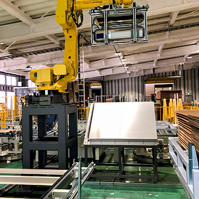 - 大型ロボットアームにより、ダンボールの自動被せを実現