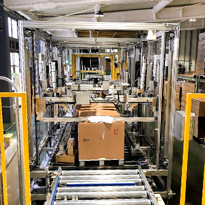 - 封函機(ボクサー・テープ)、およびバンド掛けを専用機械により自動化